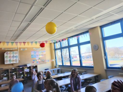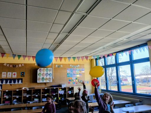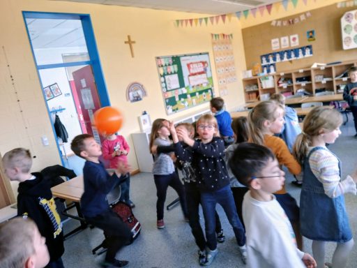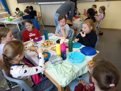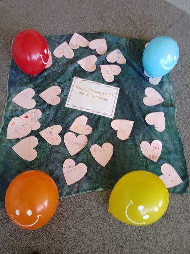 In der Religruppe 1b/c feierten die Schülerinnen und Schüler im Rahmen der Abrahamgeschichte zusammen eine fröhliche Geburtstagsparty für Isaak. Dazu gehörten neben den Herzen mit den guten Wünschen für den von Gott verheißenen Sohn natürlich auch Musik , Tanz, Luftballons, Spiele und außerdem leckere Milchbrötchen mit Erdbeermarmelade. Die Kinder hatten dabei viel Spaß und hätten gerne noch ein bisschen länger gefeiert.