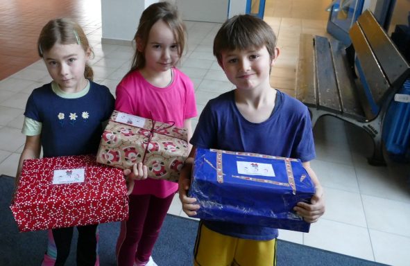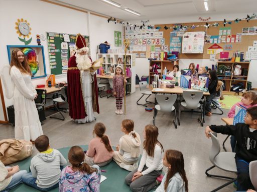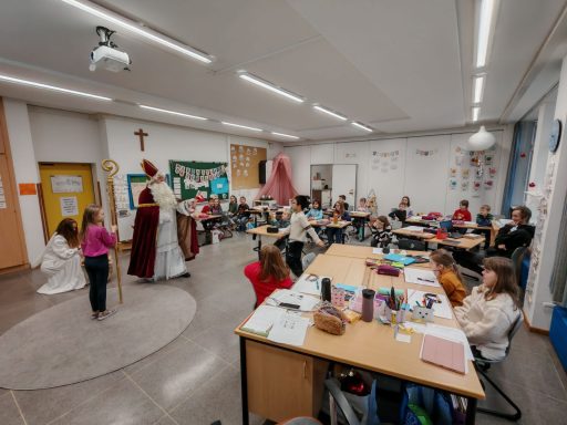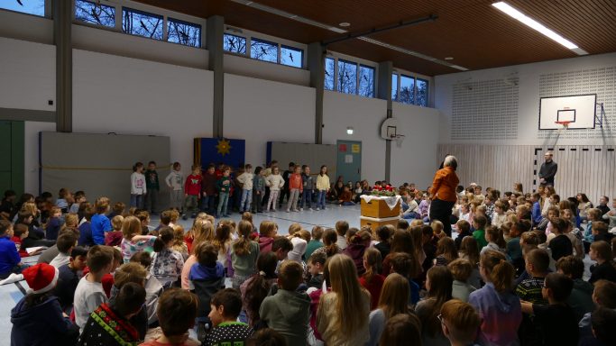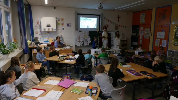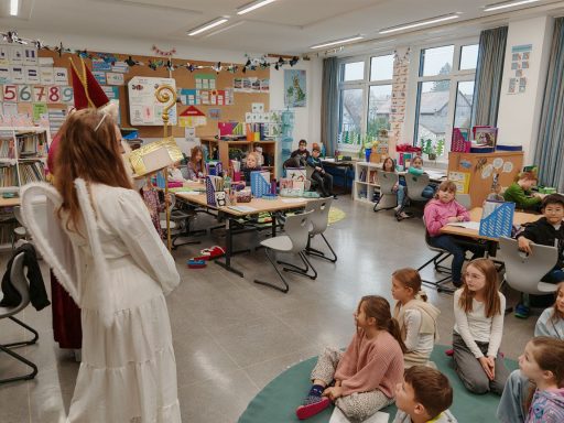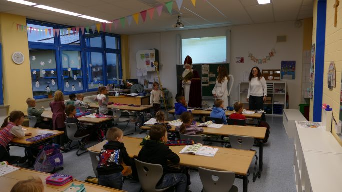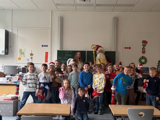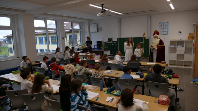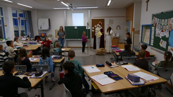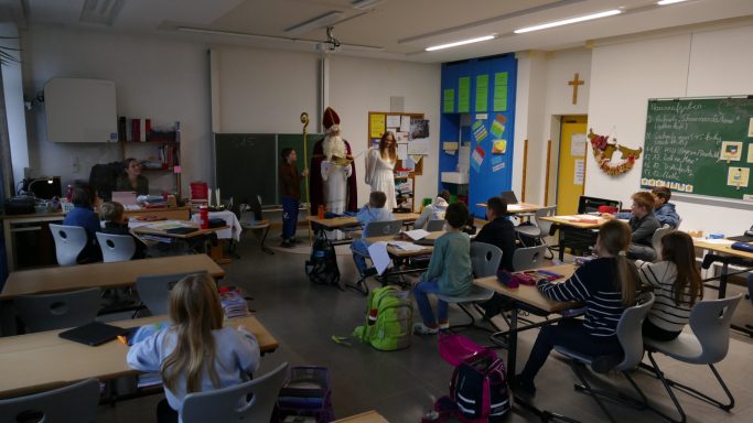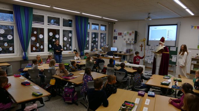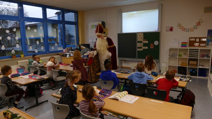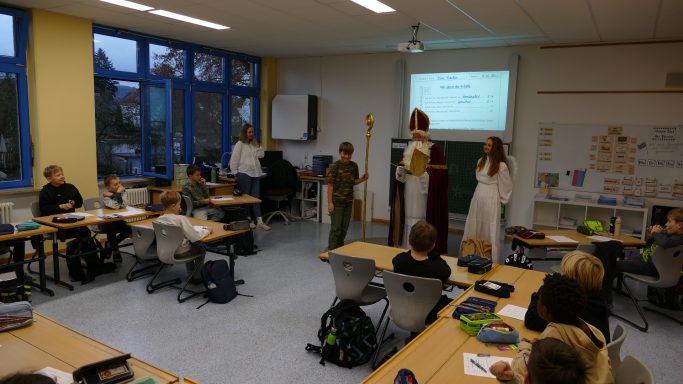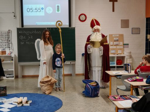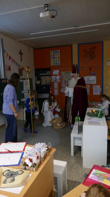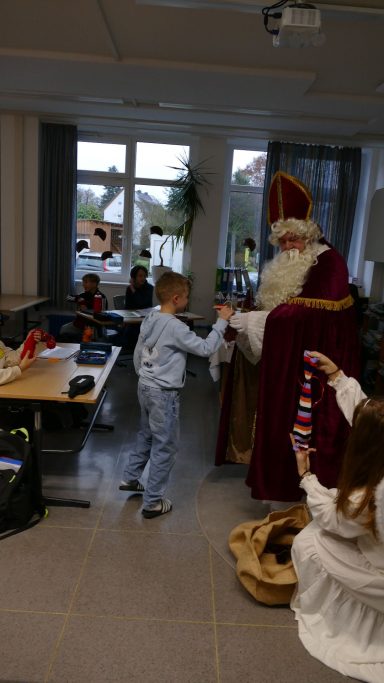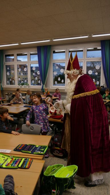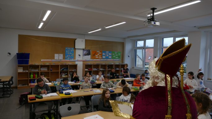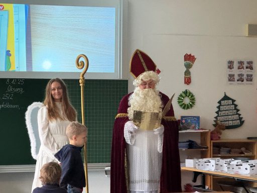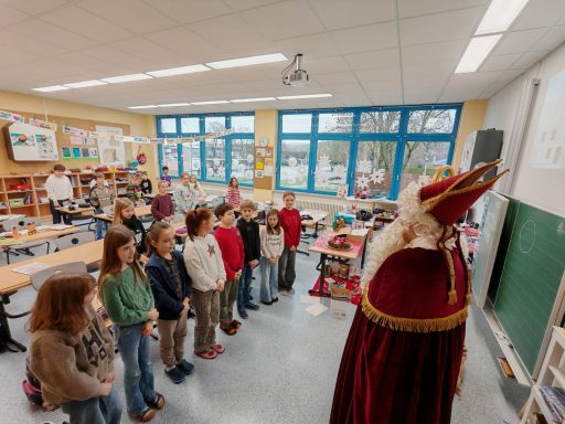 Auch in diesem Jahr war der Nikolaus wieder zu Besuch in der Schule und verteilte gefüllte Socken. Die Klassen grüßten ihn mit Lieder oder Gedichten und lauschten seinen Worten aus dem goldenen Buch.