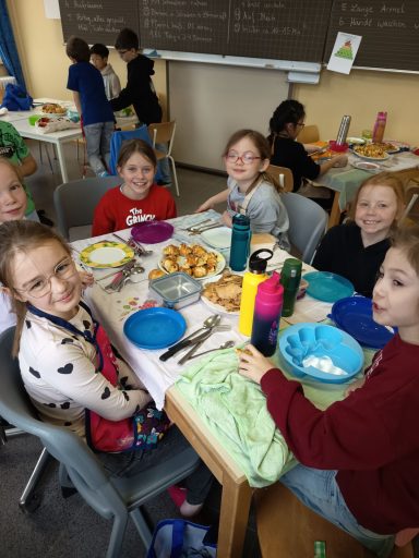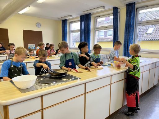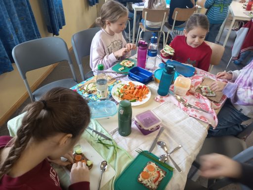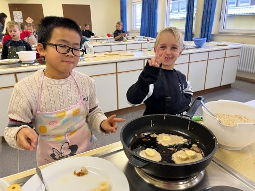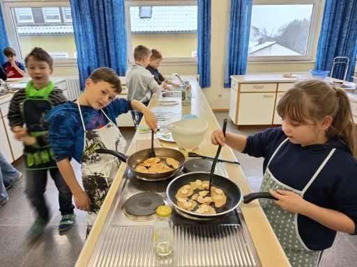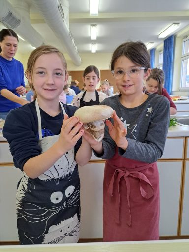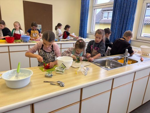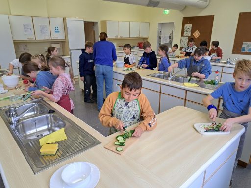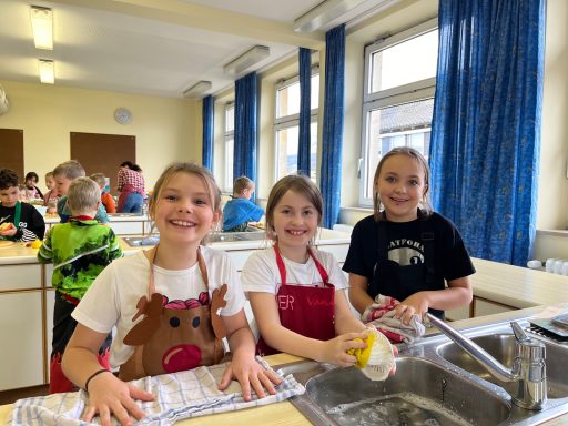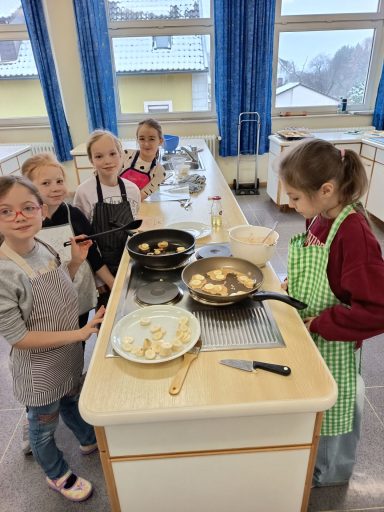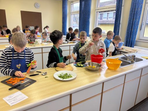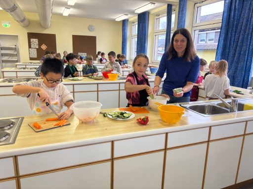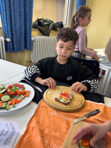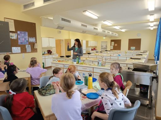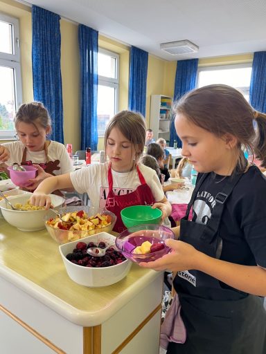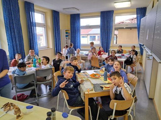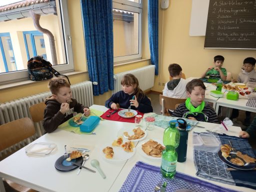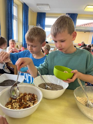 In den dritten Klassen war es dieses Jahr wieder soweit. Zeit für das Ernährungsprojekt, bei dem die Kinder lernten, welche Speisen ihrem Körper guttun und welche man meiden, bzw. reduzieren sollte. Frau Pöhlmann brachte den Kindern wichtige Grundlagen der Ernährung bei und ließ sie anschließend auch selbst Speisen zubereiten. Beispielsweise gab es eine Frühstücks-Bowl oder lustige Brotgesichter mit Frischkäse, Schnittlauch, Karotten, Paprika und Gurken. Sogar Pilze aus unserer Pilzebox konnten wir gleich dafür verwenden.