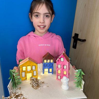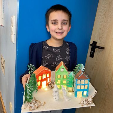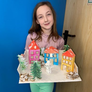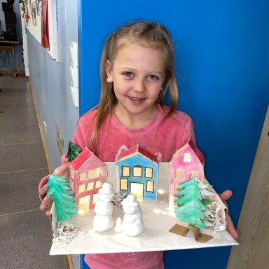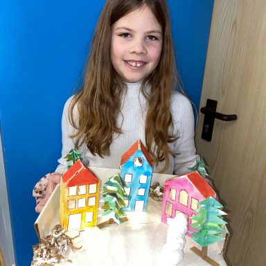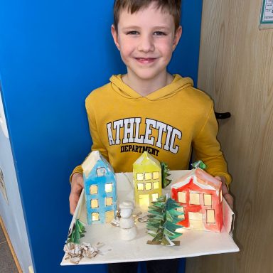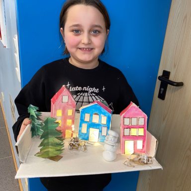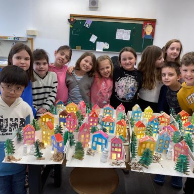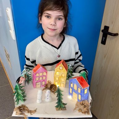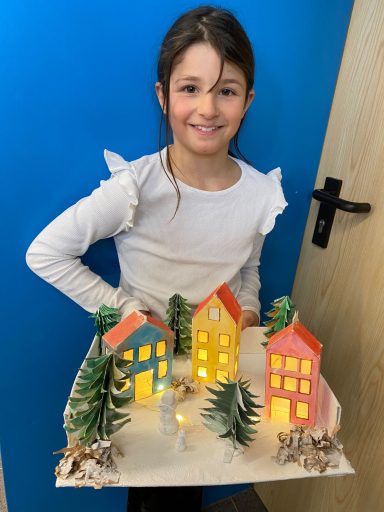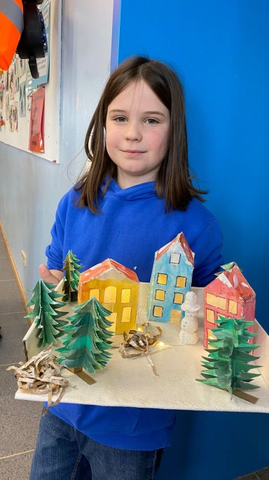 Die Klasse 3a gestaltete zusammen mit der Lehrerin Frau Greim tolle plastische Winterlandschaften und präsentiert diese stolz.