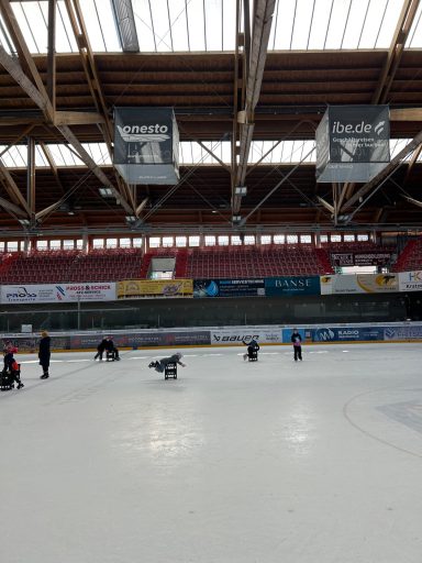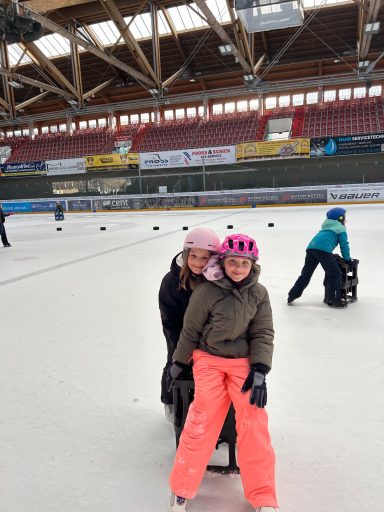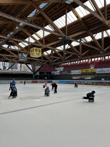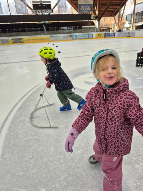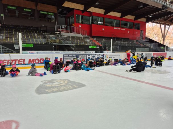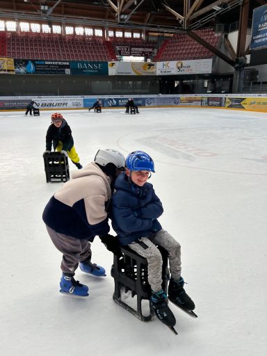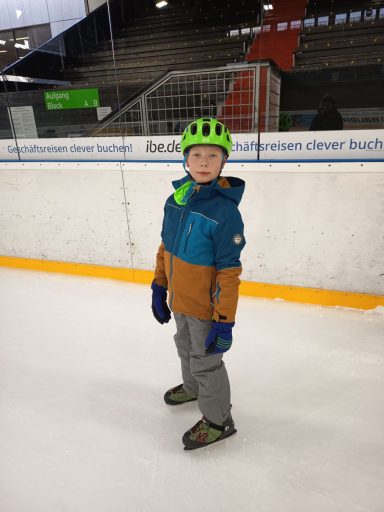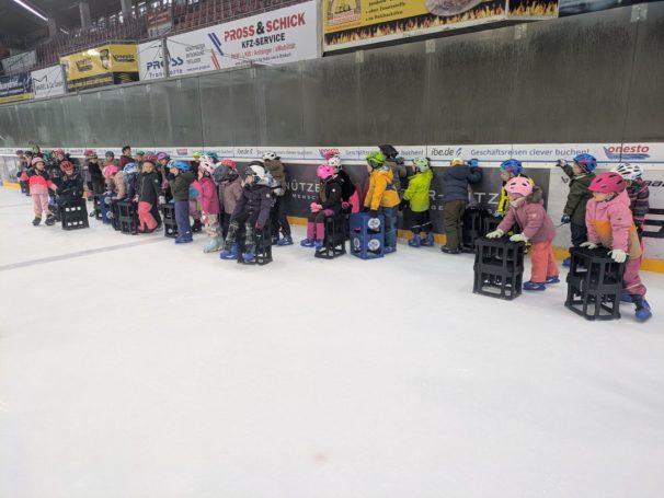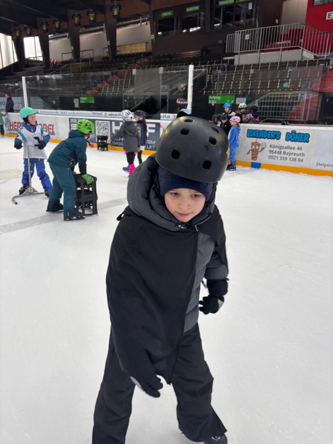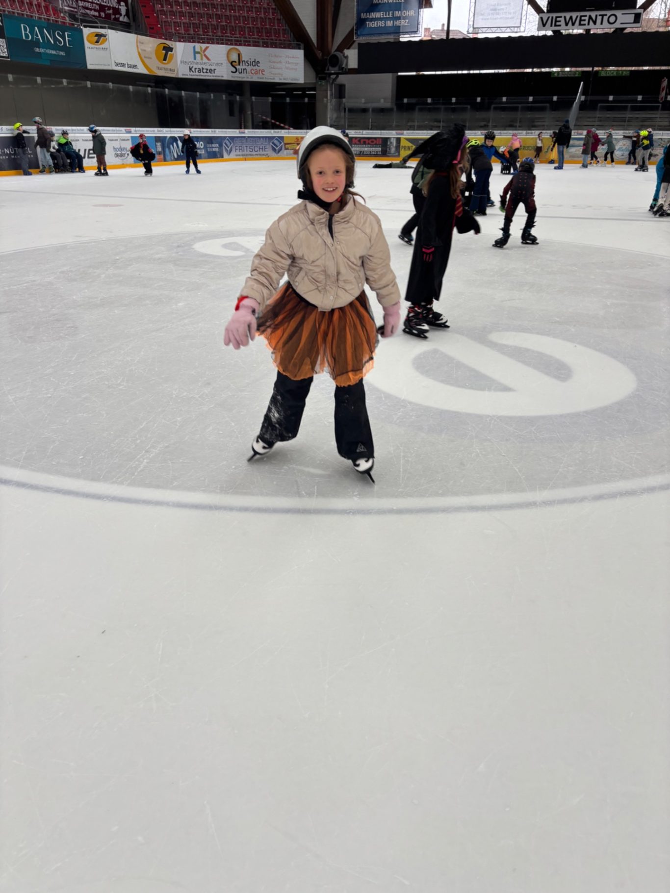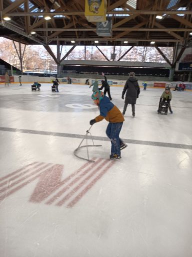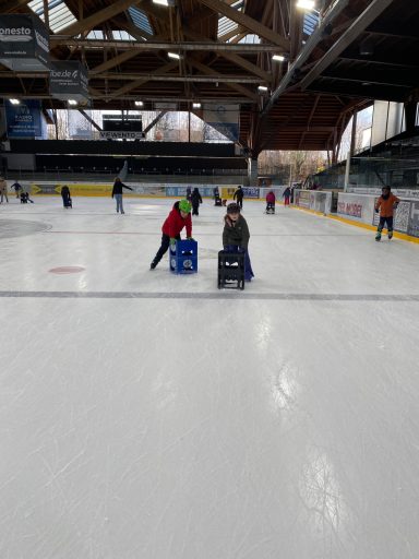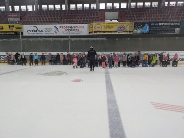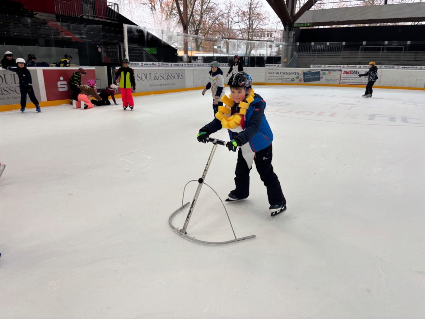 Für viele Kinder der Klassen 1a und 1b ging es zum ersten Mal aufs Eis. Absichtlich Hinfallen und wieder Aufstehen gehörte genauso dazu wie das erste Gleiten. Stolz zeigten einige am Ende schon die ersten Schritte ohne Hilfsmittel.