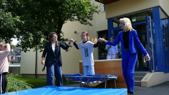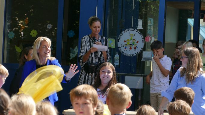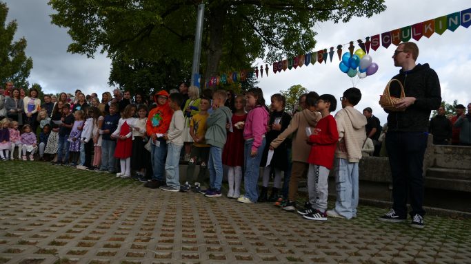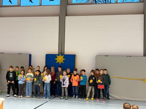 Die Patenklassen 3a, 3b und 3c gestalteten die Feier mit den Liedern „Welcome first grade“ und „Löwenstark“ sowie guten Wünschen und kleinen Willkommensgeschenken liebevoll mit.