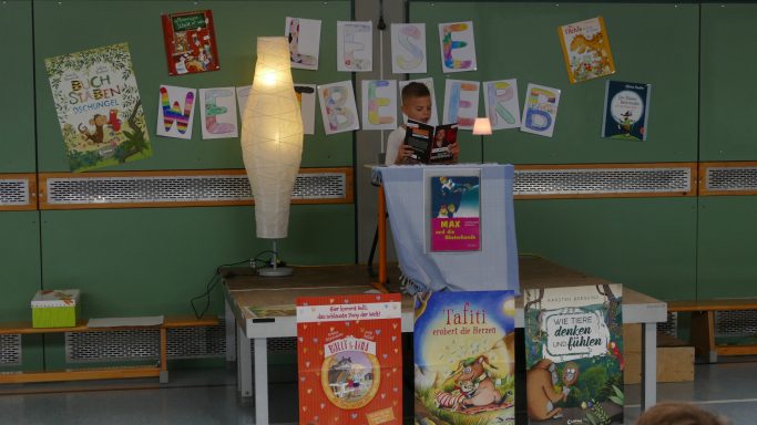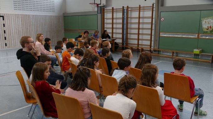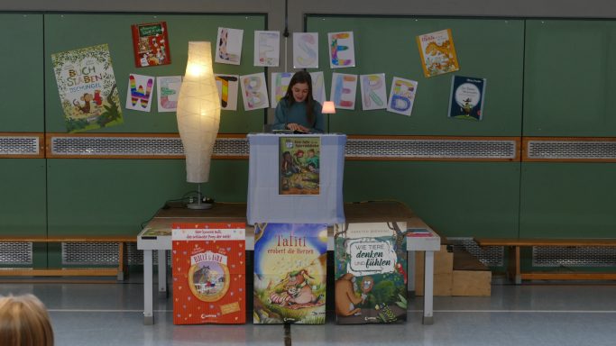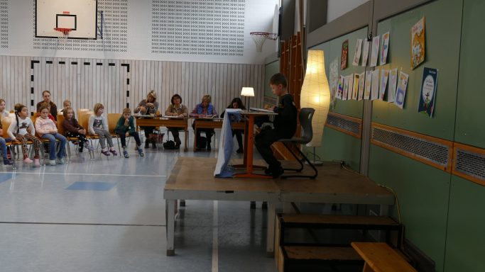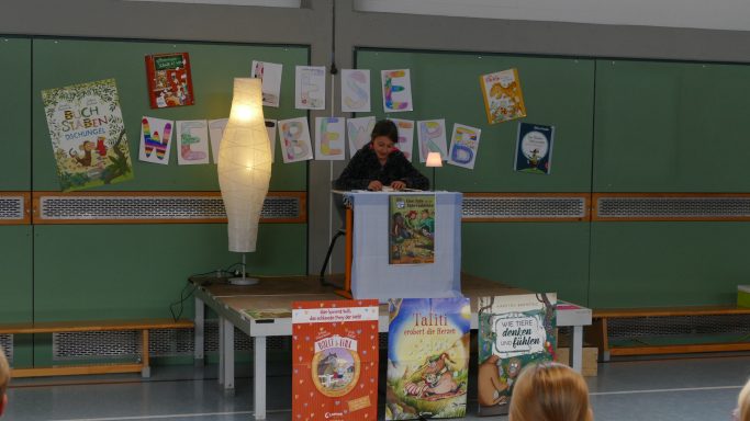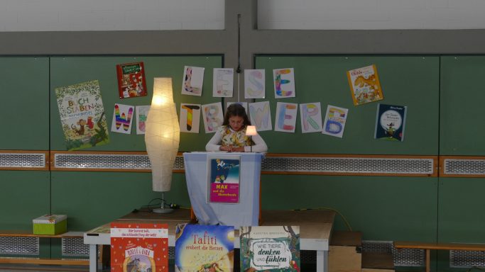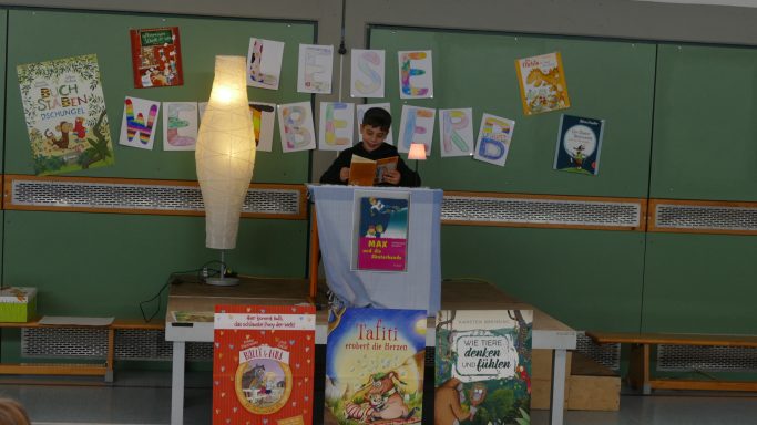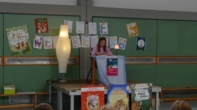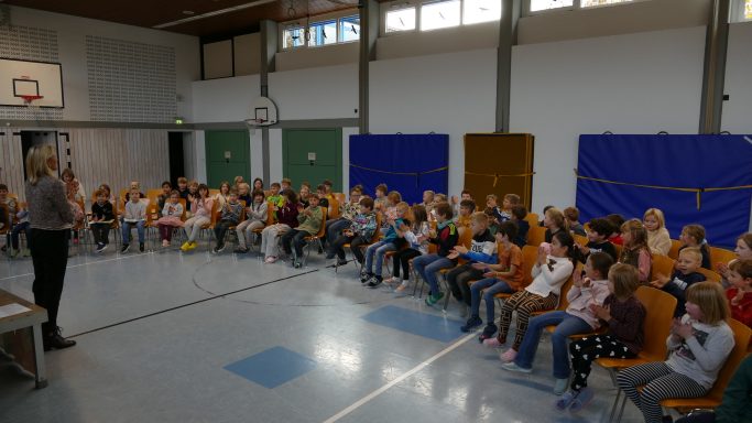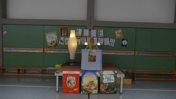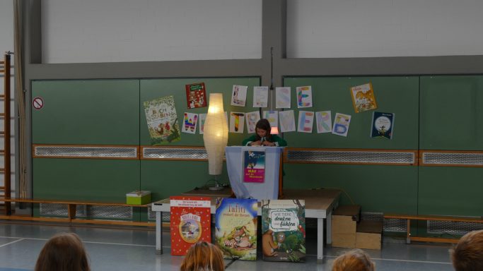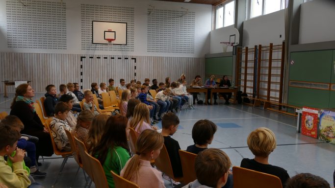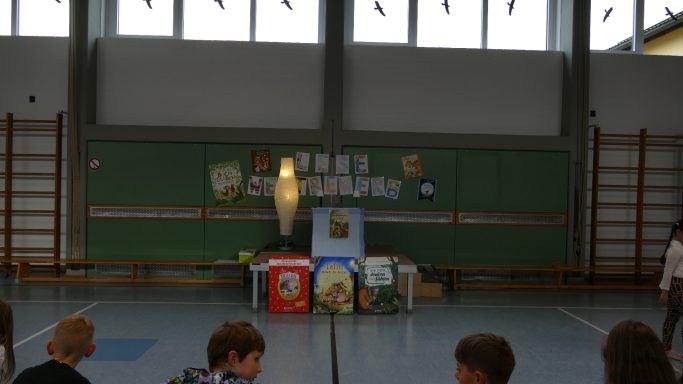 Heute waren die besten Vorleser der Schule gefragt. Aus den Jahrgangsstufen 2-4 traten die jeweils zwei besten Vorleser im Finale in der Turnhalle gegeneinander an. In jeder Jahrgangsstufe wählte die Jury aus Frau Grömer, Frau Dollinger, Frau Greim und Frau Mörlein den besten Leser oder die beste Leserin aus. Die Schüler durften durch ein Glasnugget in Gläsern ebenfalls mit abstimmen.