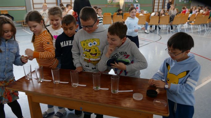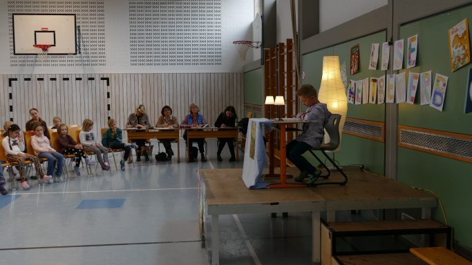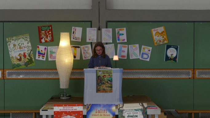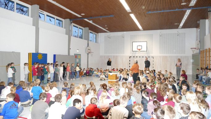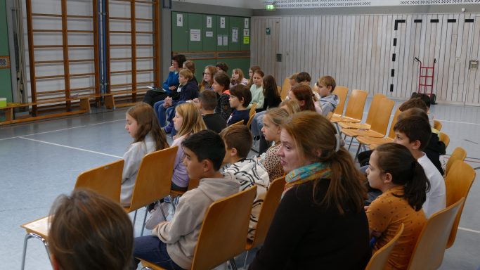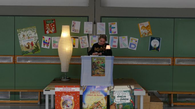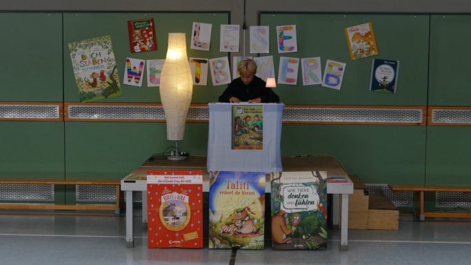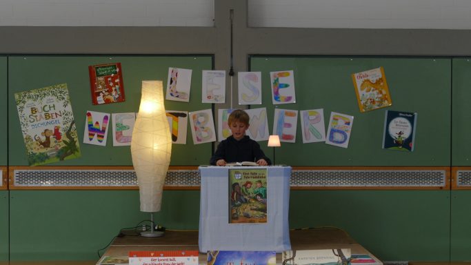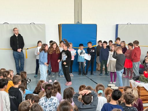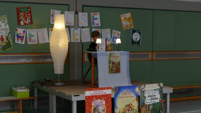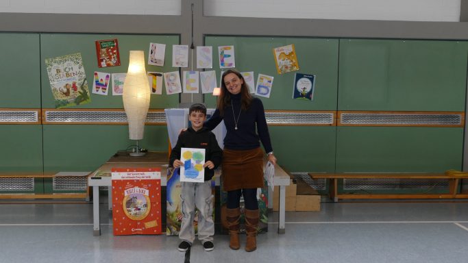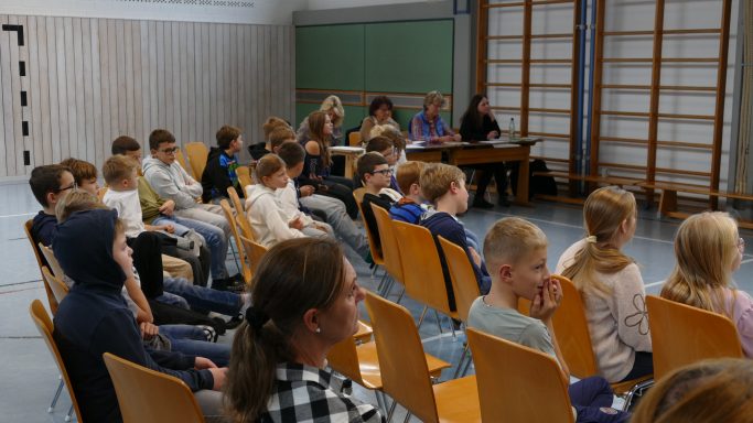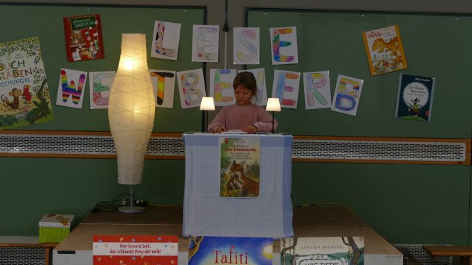 Heute waren die besten Vorleser der Schule gefragt. Aus den Jahrgangsstufen 2-4 traten die jeweils zwei besten Vorleser im Finale in der Turnhalle gegeneinander an. In jeder Jahrgangsstufe wählte die Jury aus Frau Grömer, Frau Dollinger, Frau Greim und Frau Mörlein den besten Leser oder die beste Leserin aus. Die Schüler durften durch ein Glasnugget in Gläsern ebenfalls mit abstimmen.