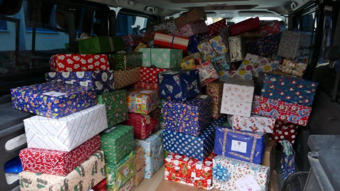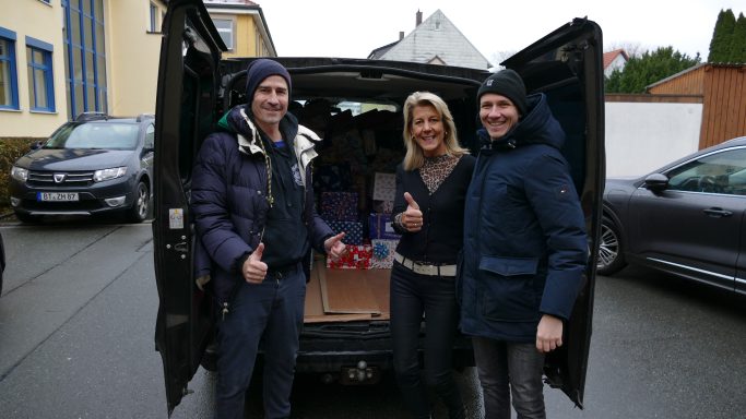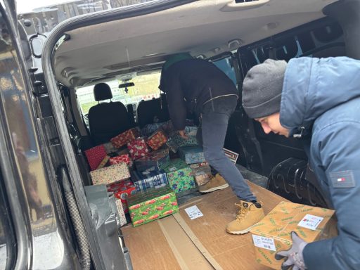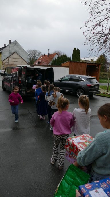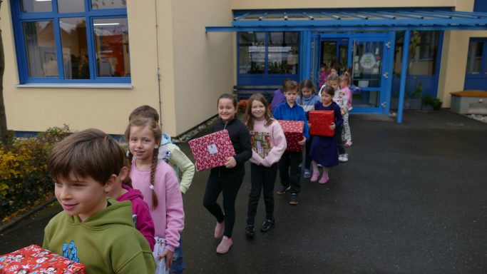 Zusammen mit Schulleiterin Sabine Mörlein luden die Schüler am 20.11.2025 166 Päckchen für den Round Table Weihnachtspäckchenkonvoi ein. Ein herzliches Dankeschön an alle Familien, die ein Päckchen gepackt haben.