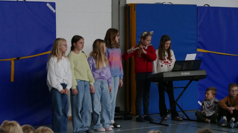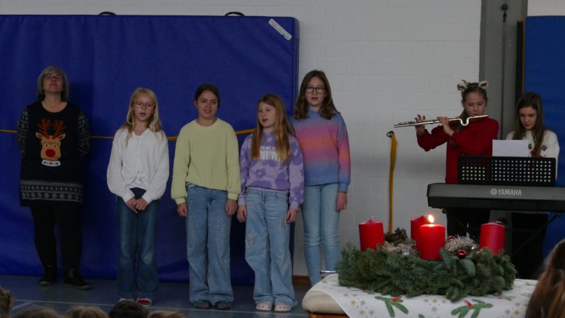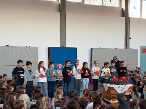 Heute am 3.12.2025 fand die erste Adentsandacht in unserer Turnhalle statt. Sechs Schülerinnen aus der 4b leisteten einen tollen Beitrag : Sie sangen "Feliz Navidad" und wurden mit Querflöte und Piano begleitet.