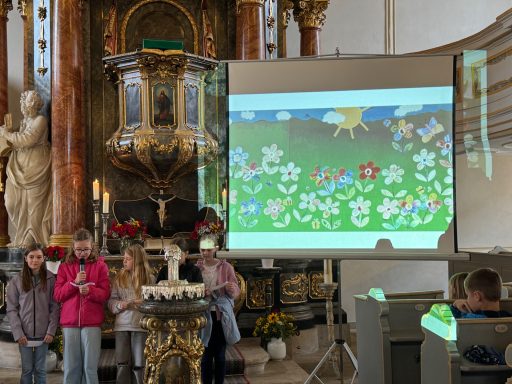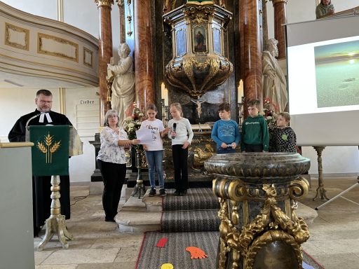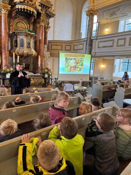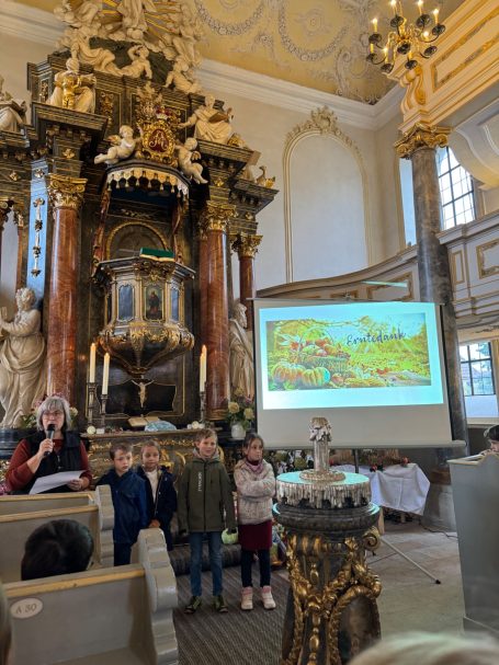 Am Montag, 6.10.25, fand für die ersten und zweiten Klassen der Grundschule ein Erntedankgottesdienst statt. Neben Liedern, Gebeten, einer passenden Geschichte und dem Anschauen der vielfältigen Erntegaben in der Kirche, wurde den Kindern klar, warum Erntedank gefeiert wird.