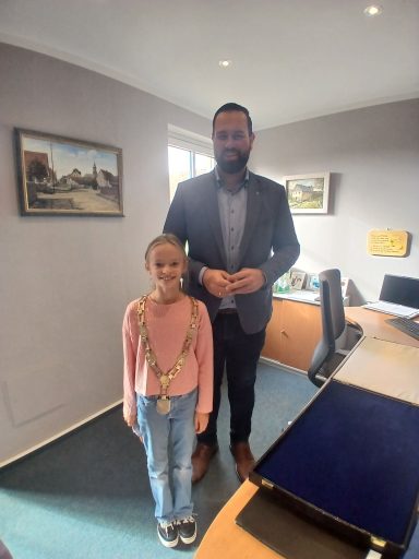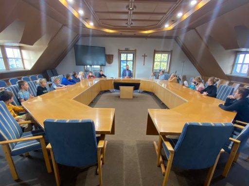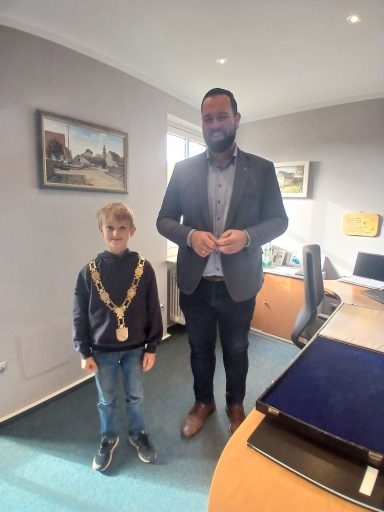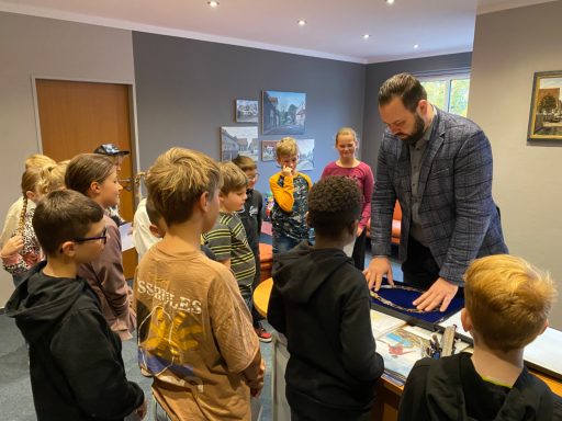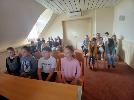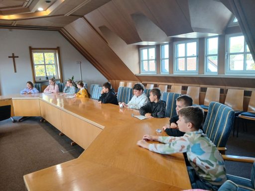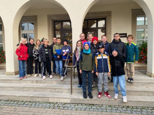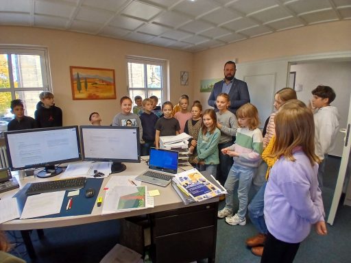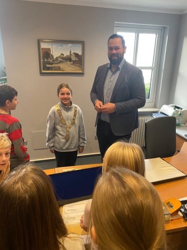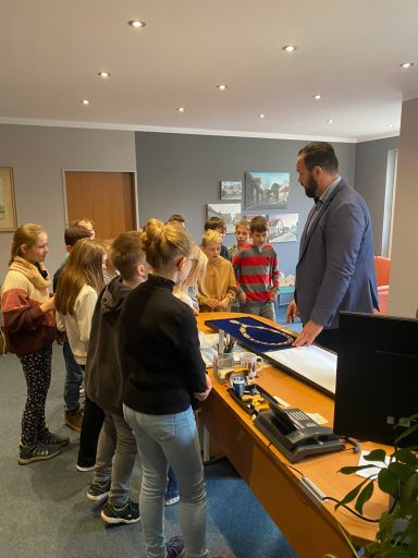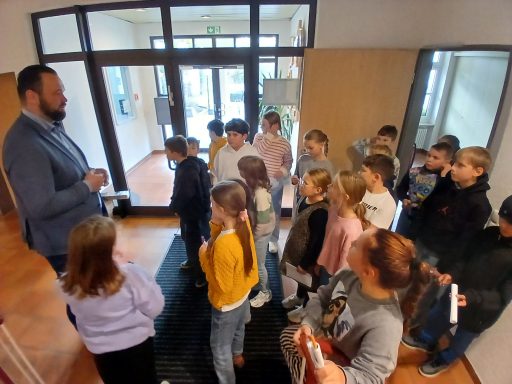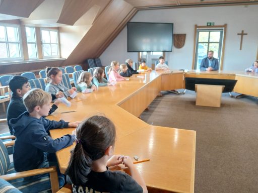 Die Klassen 4a,b und c machten am 14.10.2025 einen Unterrichtsgang zum Rathaus und wurden dort vom Bürgermeister persönlich empfangen und auch herumgeführt. Anschließend nahmen die Schülerinnen und Schüler im Sitzungssaal Platz und durften Herrn Brunner mit zahlreichen Fragen löchern. Vielen Dank für Ihre Zeit und Geduld, Herr Bürgermeister!