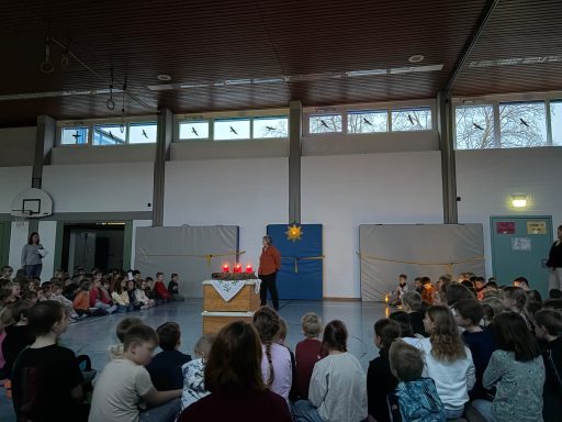 Am letzten Schultag vor den Weihnachtsferien fanden zwei Gottesdienste der GS Bindlach statt. Diesmal ging es um die Entstehung und Bedeutung der Weihnachtskrippe. Es waren zwei stimmungsvolle Gottesdienste, die die gesamte Schulfamilie auf das bevorstehende Weihnachtsfest einstimmte.