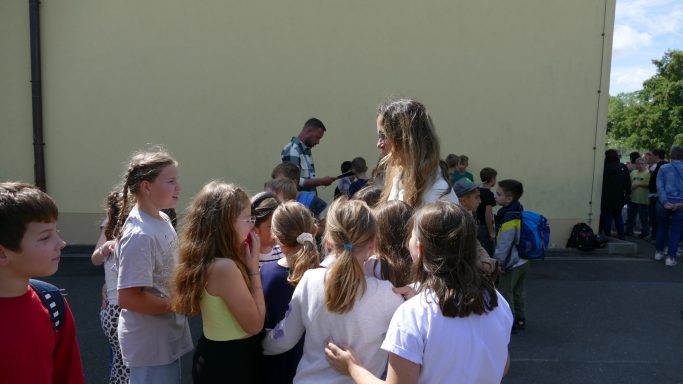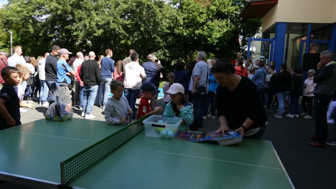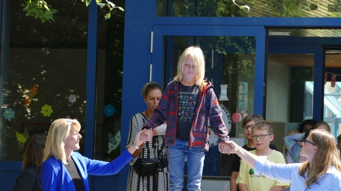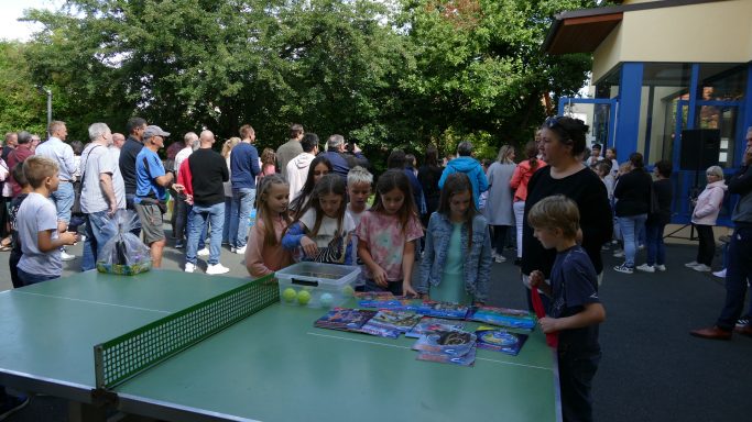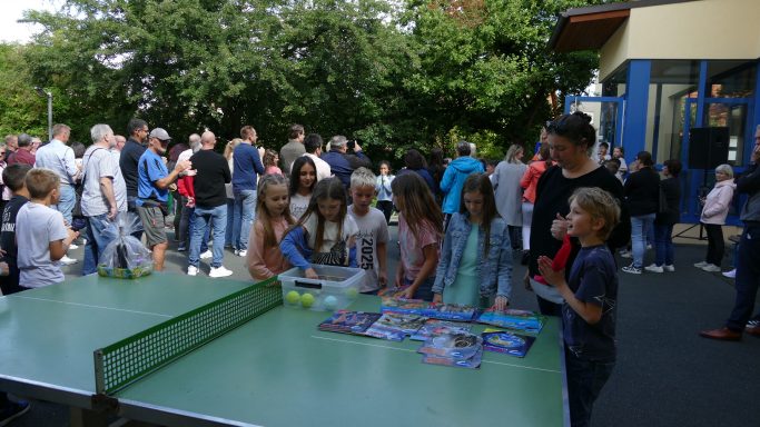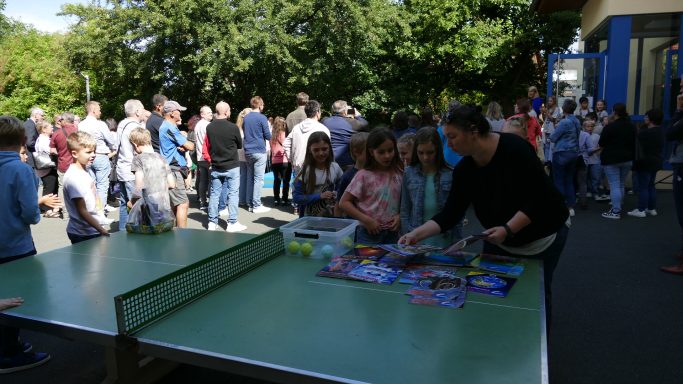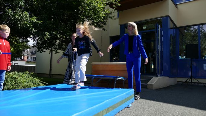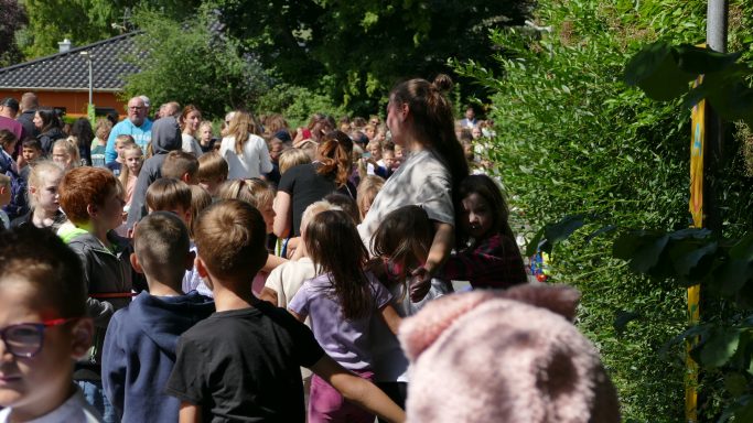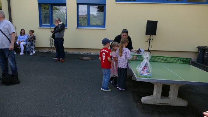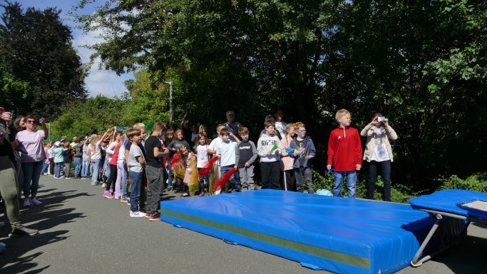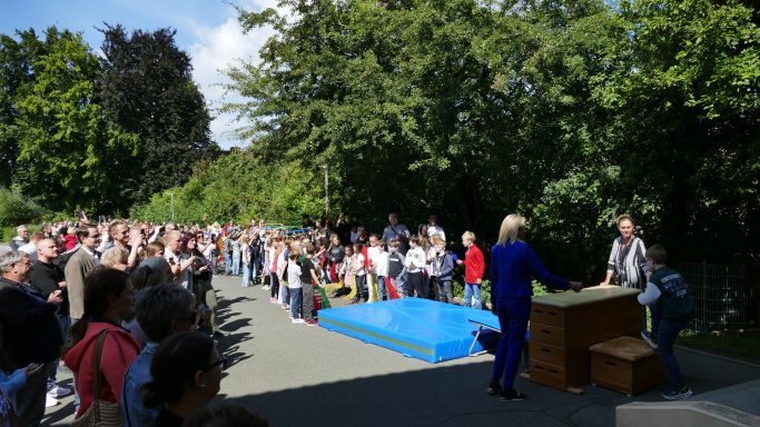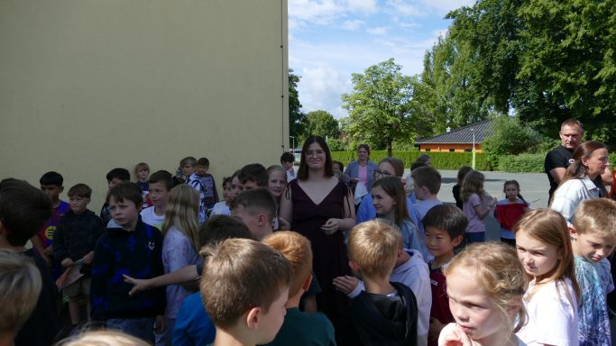Am letzten Schultag werden die Klassenbesten geehrt und durfen sich an der Tischtennisplatte ein Buch oder einen Ball aussuchen. Danach werfen wir traditionell die Viertklässler aus der Schule. Mit Kasten, Trampolin und Weichbodenmatte verlassen die Schüler an diesem Tag mit einem Sprung ihre Grundschule. Die Klassenleiter verabschiedeten jeden Schüler einzeln mit viel Witz und durch das Spalier ihrer Mitschüler ging es zu den wartenden Eltern.