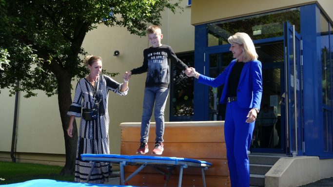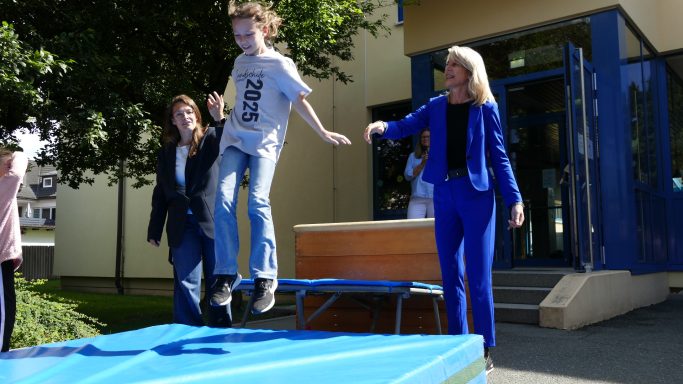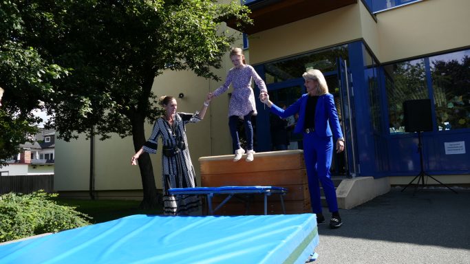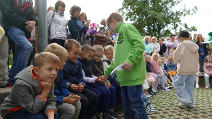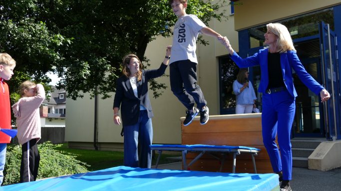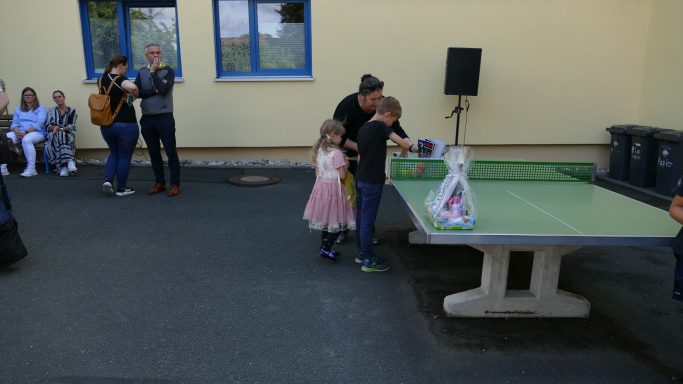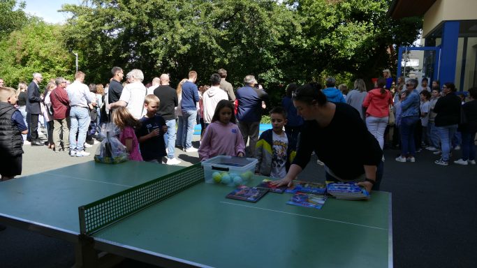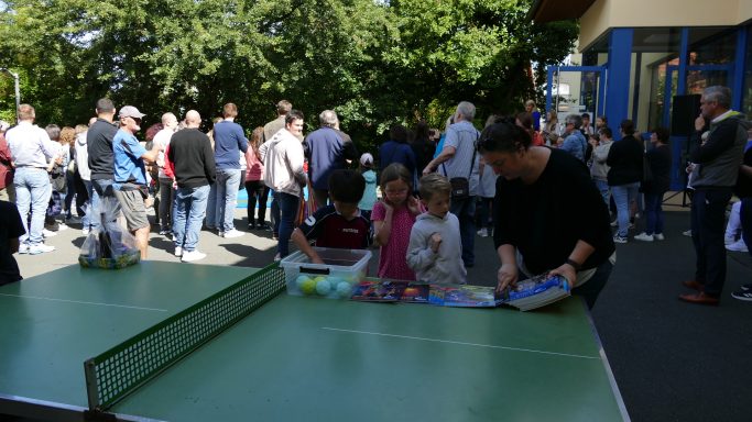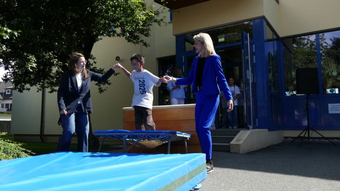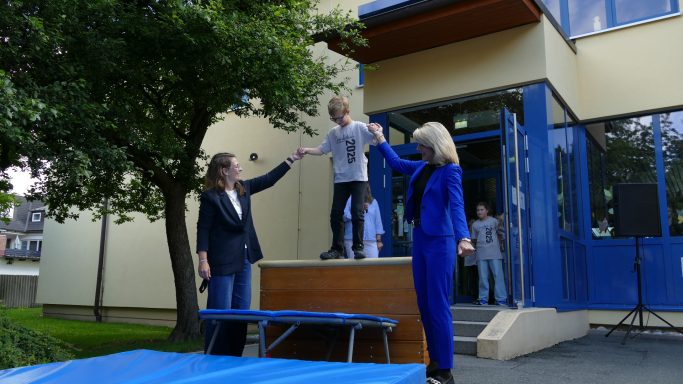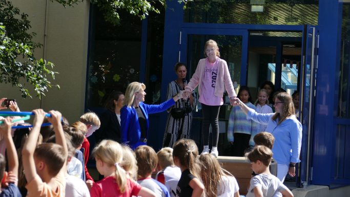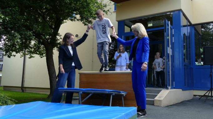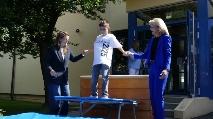 Am letzten Schultag werden die Klassenbesten geehrt und durfen sich an der Tischtennisplatte ein Buch oder einen Ball aussuchen. Danach werfen wir traditionell die Viertklässler aus der Schule. Mit Kasten, Trampolin und Weichbodenmatte verlassen die Schüler an diesem Tag mit einem Sprung ihre Grundschule. Die Klassenleiter verabschiedeten jeden Schüler einzeln mit viel Witz und durch das Spalier ihrer Mitschüler ging es zu den wartenden Eltern.