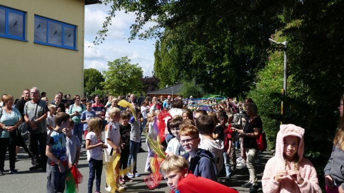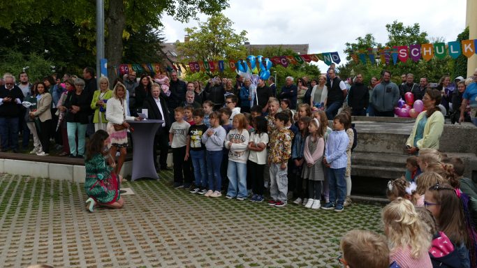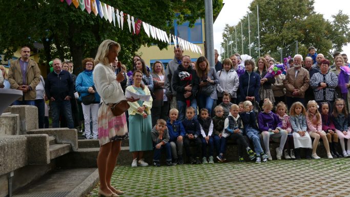 Nach einem stimmungsvollen Anfangsgottesdienst in der Bartholomäus- Kirche wurden die 75 neuen Erstklässler am Brunnen im Pausenhof von Schulleiterin Sabine Mörlein und ihren neuen Lehrkräften herzlich begrüßt.