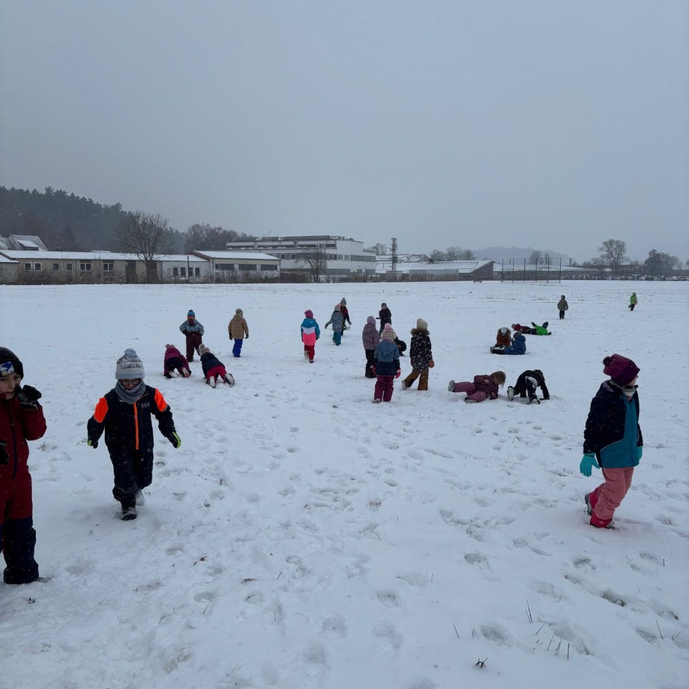 Die ersten Klassen haben die Chance genutzt und ihre Sportstunden nach außen in den Schnee verlegt. Beim Laufen, Bauen und Spielen im Schnee hatten alle einen großen Spaß.