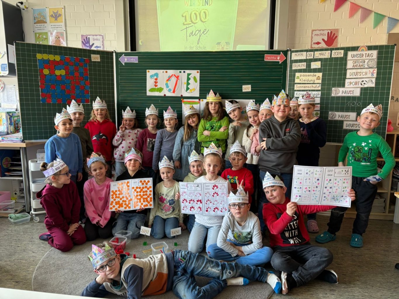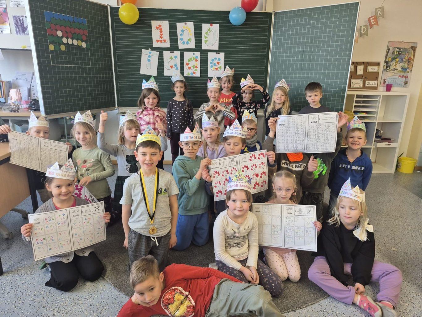 Darauf haben alle hingefiebert. Fleißig wurde jeder Tag seit Schuljahresbeginn gezählt und in einer Liste notiert. Heute war es dann endlich so weit. Unsere Erstklässler sind bereits 100 Tage ein Schulkind. Der ganze Tag stand unter diesem Motto. Nachdem sich alle eine Krone gebastelt haben, wurde dies an zahlreichen Stationen ausgiebig gefeiert: 100 Fingerabdrücke, 100 Unterschriften, 100 Zahlen mit Regenbogenstift schreiben, 100 Buchstaben stempeln, 100 Weintrauben essen, 100 Steckwürfel zusammenstecken und noch vieles mehr. Auch in Sport durfte jedes Kind 100 Aufgaben erledigen.